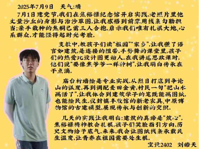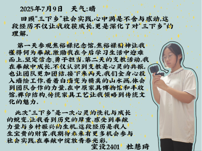 这些文字里,有对焦裕禄精神的共鸣,有对专业实践的顿悟,更有对乡村振兴的热忱。“三下乡”的旅程虽已结束,但它在队员们心中种下的“扎根土地、服务人民”的种子,终将在未来的学习与实践中生根发芽。正如他们所坚信的,最好的成长,是把青春写在祖国需要的地方——这份从实践中汲取的力量,定会指引他们在“建证美好中国”的路上,走得更稳、更远。