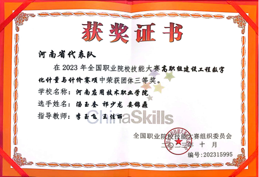 2023年10月28日,由教育部等36个部门主办的2023年全国职业院校技能大赛高职组“建设工程数字化计量与计价”赛项在青海建筑职业技术学院举行,来自全国32个省、市、自治区的76支代表队参与角逐,经过激烈比拼,beat365官网建筑工程学院学生汤玉奎、祁少龙、娄锦鼎组成的代表队荣获全国团体三等奖。