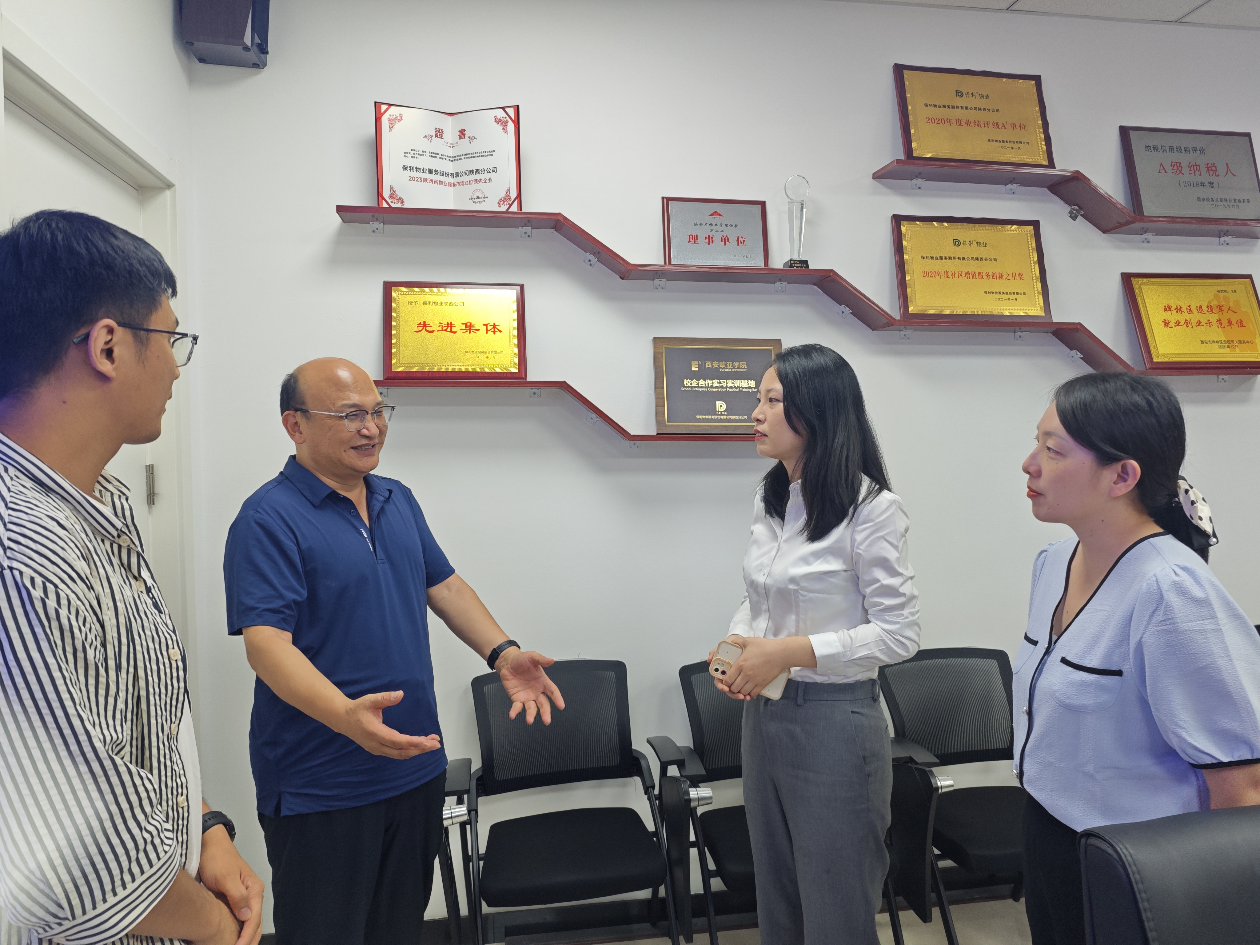 为进一步贯彻落实高校毕业生就业工作决策部署,开拓更多就业岗位,服务学生高质量就业,打通用人单位和毕业生之间的信息壁垒,全力拓宽学生就业渠道,2024年7月30日,建筑工程学院党总支书记张虎、党总支副书记刘亚娟、团总支书记王莹及专职辅导员罗斐、宋雅雯一行至保利物业服务有限公司陕西分公司开展走访调研。