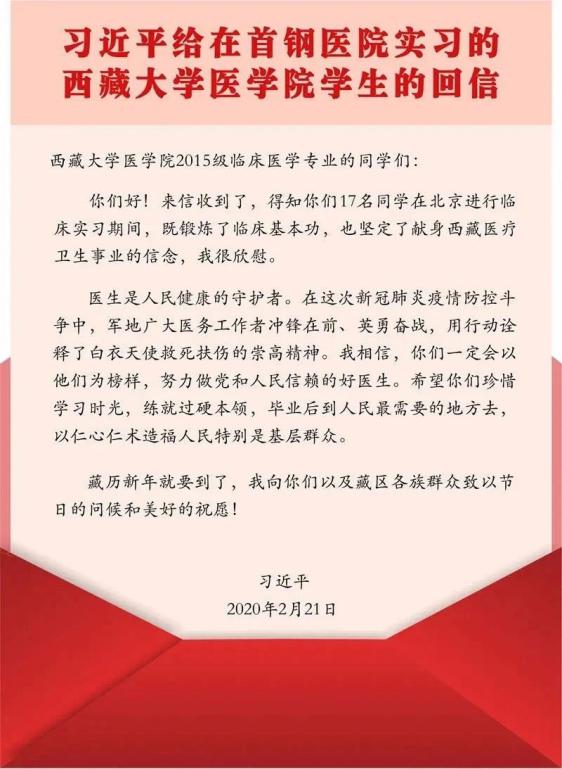 2019年6月17名西藏大学同学来到首钢医院,开始为期11个月的临床实习。不久前,他们给习近平总书记写信,汇报了实习以来的收获和感悟,表达了对党和国家的感恩之情,以及学好本领后报效祖国、建设家乡的决心。总书记的回信让他们备受鼓舞与振奋。短短几百字的回信,让我们感受到了习近平总书记对广大青年学子的深切关怀和深厚期望。一句“到人民最需要的地方去”激励了无数青年学子奋发向上!