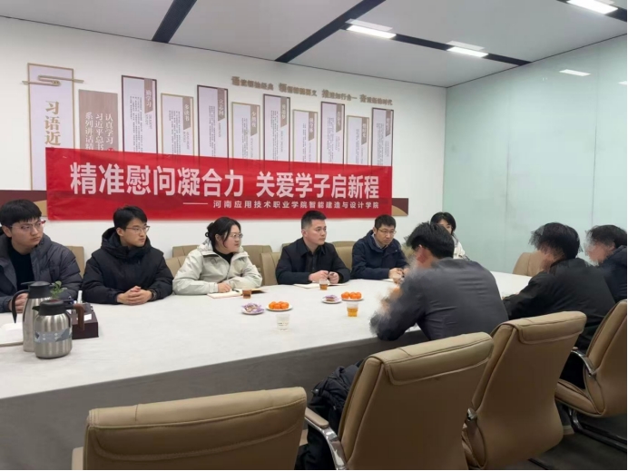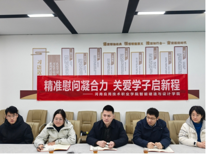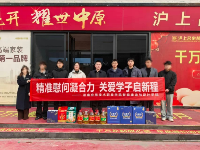 2026年1月27日,beat365唯一官方网站党总支书记宁晓冬、副书记张蓄金、学工办主任史真、建筑装饰设计教研室主任田然、专职辅导员李希望、尹宇龙一行,赴河南沪上名家装饰工程设计有限公司,对进行岗位实习的家庭经济困难学生进行走访慰问。