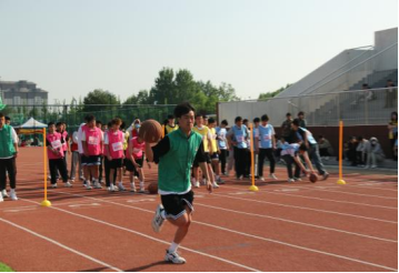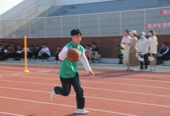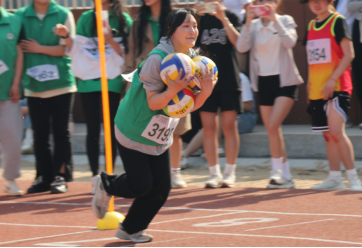 手中的三个排球承载着队伍满满的希冀,被同学们拥入怀里,又小心翼翼地在终点传递。有时球顽皮地从手中滚落,立马有同学大步冲向前,帮忙拾起那象征着集体力量的篮球,继续前行。一个完美的弧线和急转弯,凝聚着大家的希望!