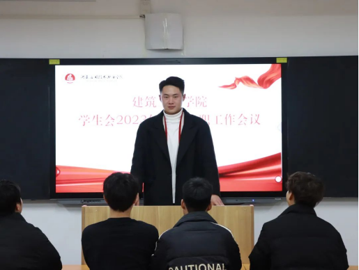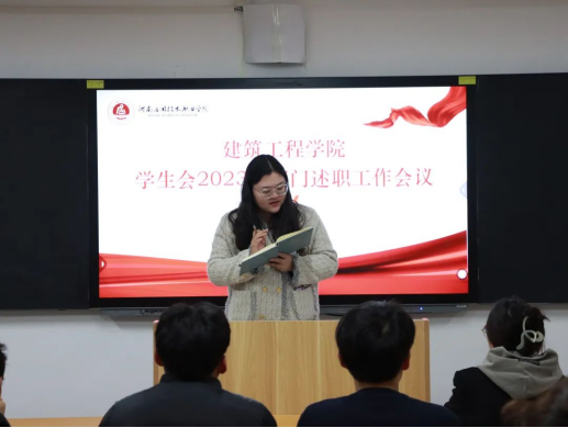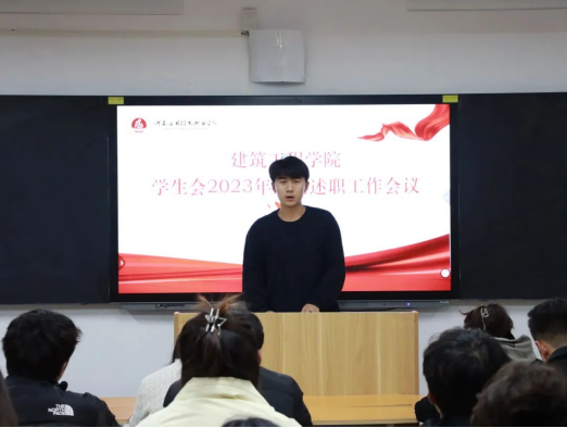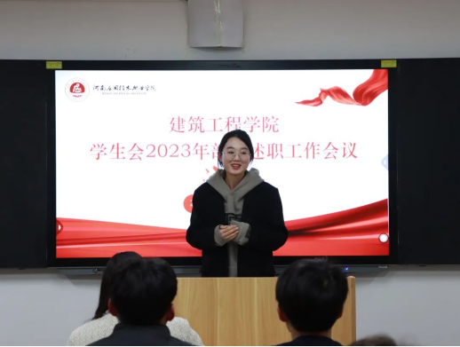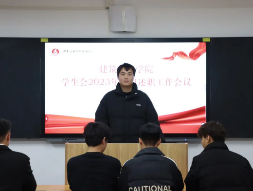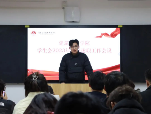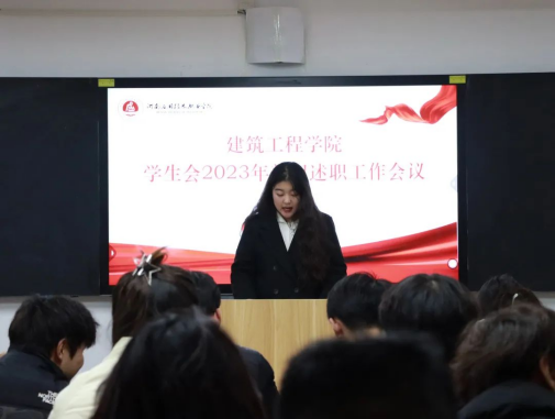 为总结回顾2023年学院学生会工作情况,夯实学生会改革成效,加强学院学生会人员工作能力建设,增强学生会的凝聚力,保证学院学生会各项工作落实到位,建筑工程学院于2024年1月4日组织开展学生会2023年部门述职工作会议。此次会议由建筑工程学院学工办主任史真主持,辅导员赵影以及学生会主席团、各部门部长、副部长参加。