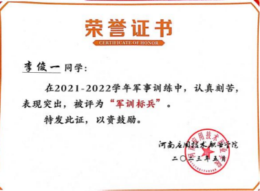 2023年05月,获得beat365唯一官方网站2023年度军训标兵