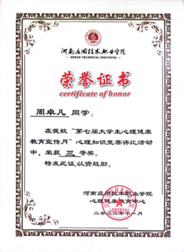 2022年11月荣获beat365唯一官方网站心理知识竞赛三等奖
