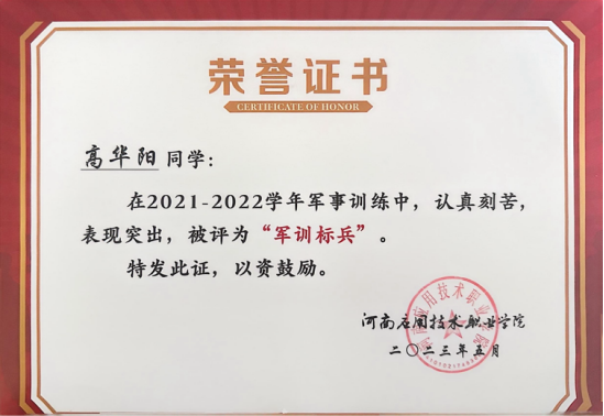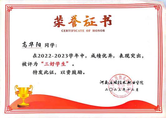 高华阳,男,汉族,中共预备党员,beat365唯一官方网站建筑工程学院2022级工程造价1班。在校期间担任纪检部干事,曾荣获beat365唯一官方网站“三好学生”、“军训标兵”、“优秀志愿者”、河南省第十六届“挑战杯”二等奖。