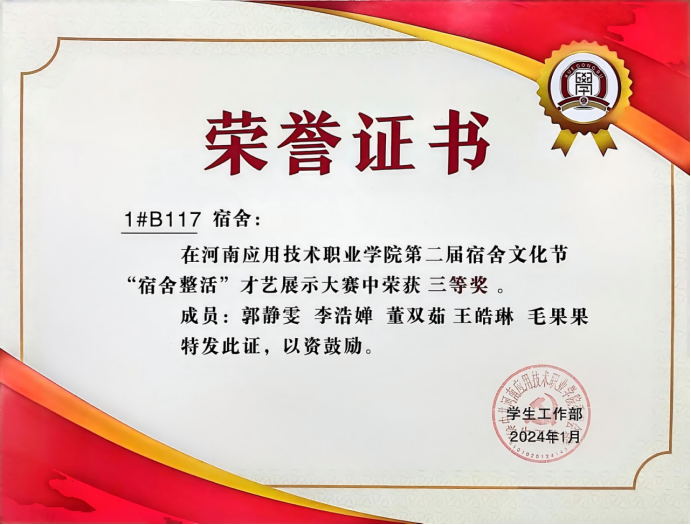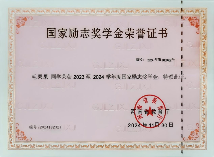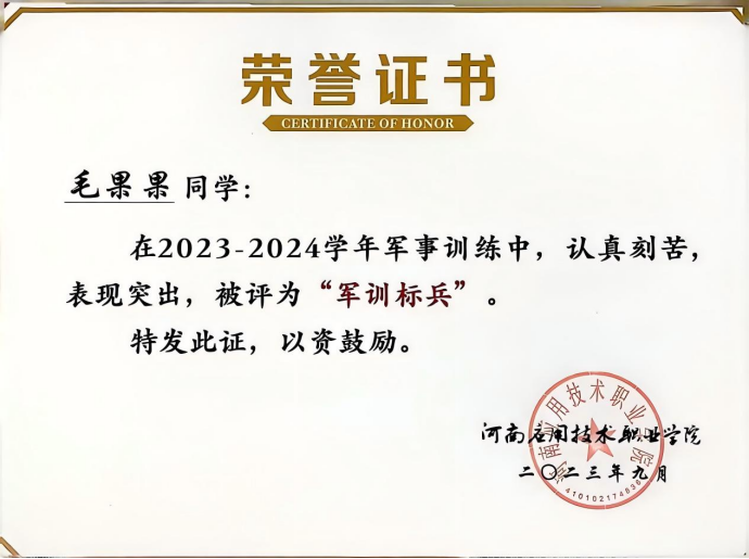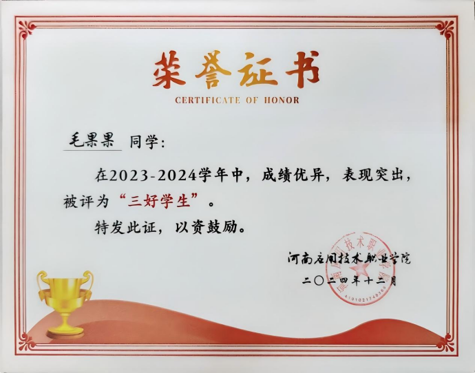 毛果果,女,汉族,中共预备党员,beat365唯一官方网站建筑工程技术2301班学生,辅导员罗斐。全年综合量化与专业成绩均稳居班级第一。在校期间曾获国家励志奖学金、省级三好学生、优秀共青团员、优秀学生干部,2024年中国国际大学生创新创业大赛河南省选拔赛三等奖、2025年该赛事河南省选拔赛二等奖,持有国家版权局计算机软件著作权登记证书。