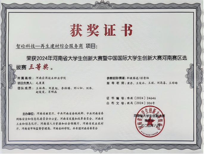在学好专业知识的同时,她积极将理论转化为实践,在创新创业领域不断探索。2024年,她带领团队征战中国国际大学生创新创业大赛河南省选拔赛,凭借对建筑行业技术痛点的精准把握,设计出实用型项目,斩获省级三等奖;2025年,她与团队总结经验、优化方案,再次参赛拿下省级二等奖。不仅如此,她还成功取得国家版权局计算机软件著作权登记证书,用创新成果展现了建筑工程技术专业学子“敢闯敢试、善作善成”的精神风貌。