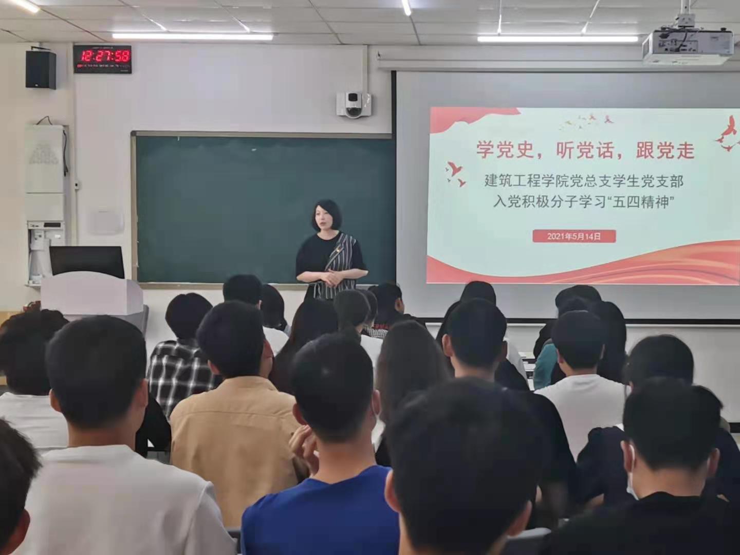习近平在纪念五四运动100周年大会上发表重要讲话指出,新时代中国青年要继续发扬五四精神,以实现中华民族伟大复兴为己任,不辜负党的期望、人民期待、民族重托,不辜负我们这个伟大时代。为让入党积极分子进一步深入理解五四精神的内涵和时代价值。2021年5月14日中午,建筑工程学院党总支学生党支部组织东西校区全体入党积极分子同步进行观看学习“五四精神”。