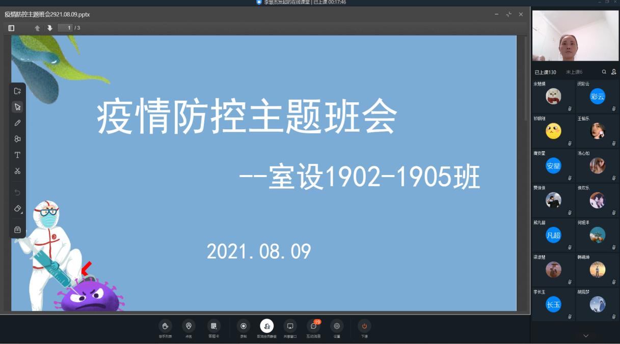 当下国内多地疫情防控形势严峻复杂,为增强我院学生疫情防控意识,贯彻落实学校对疫情防控的要求,进一步做好疫情期间学生的管理工作.在建筑工程学院党总支书记马春燕的安排部署下,各班辅导员、班主任组织召开了线上疫情防控安全教育主题班会。