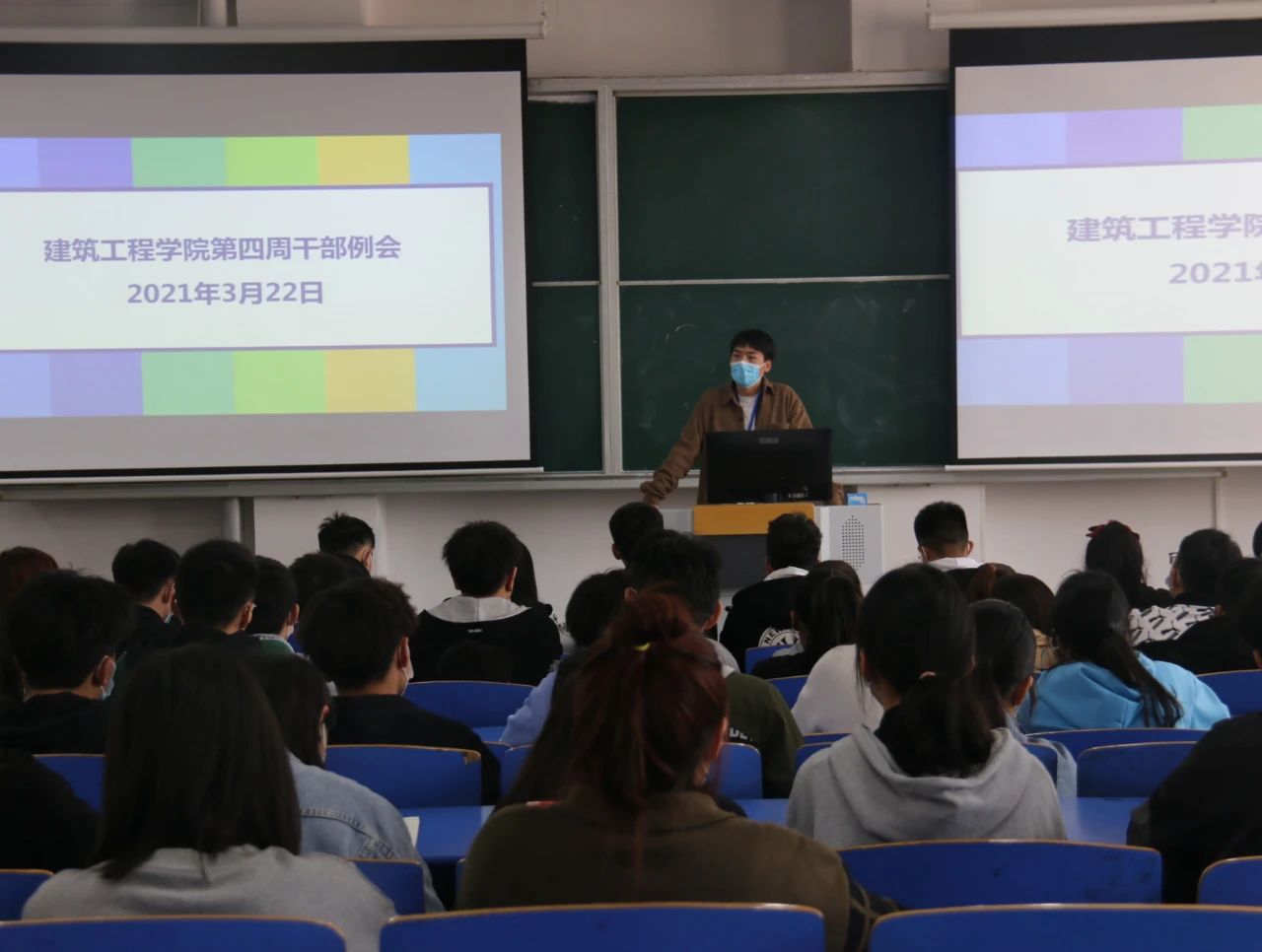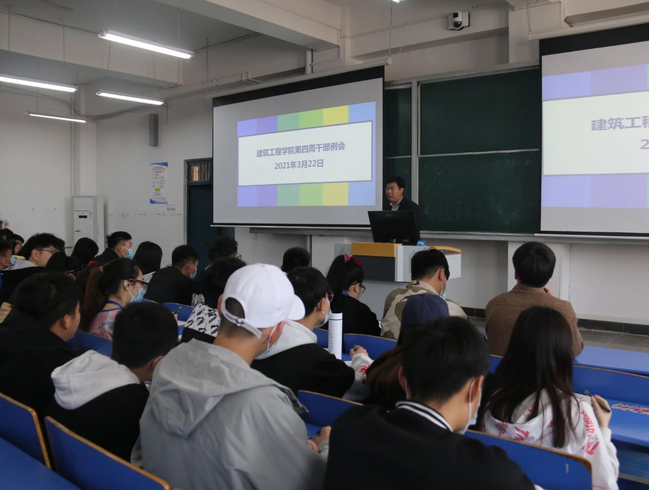 为提高小筑们的积极性,提升工作和学习的效率,建筑工程学院于2021年3月22日中午12:30,在B楼102教室召开了建筑工程学院第四周学生干部例会,(东校区以视频会议方式参加),参与本次会议的有刘高喜老师、李慧杰老师、孙雪理老师、团学会全体成员、入党积极分子及各班班长、团支书。会议开始,刘高喜老师强调,春季是流行病高发季节,大家要多参加校园活动,多锻炼,提高自身素质,宿舍要保持内务整洁,及时通风,预防传染性疾病发生。