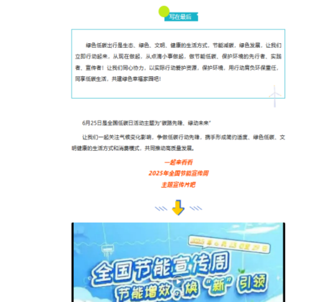 为全面深入贯彻习近平生态文明思想,完整、准确、全面贯彻新发展理念和党中央关于绿色低碳发展的战略部署,充分发挥政治引领作用,引导广大师生将低碳理念融入日常、转化为自觉行动。活动期间,学院以公众号“筑造辉煌”为核心传播载体,持续推送节能知识与低碳生活指南,聚焦“随手关灯、节约用电”“无纸化办公、减少耗材”“垃圾分类、资源循环”等实用技巧开展重点普及。通过常态化宣传引导与“节能低碳,你我同行”的倡议号召,推动全体师生从“被动遵守”转向“主动参与”,为践行“双碳”目标凝聚起学院的集体力量。